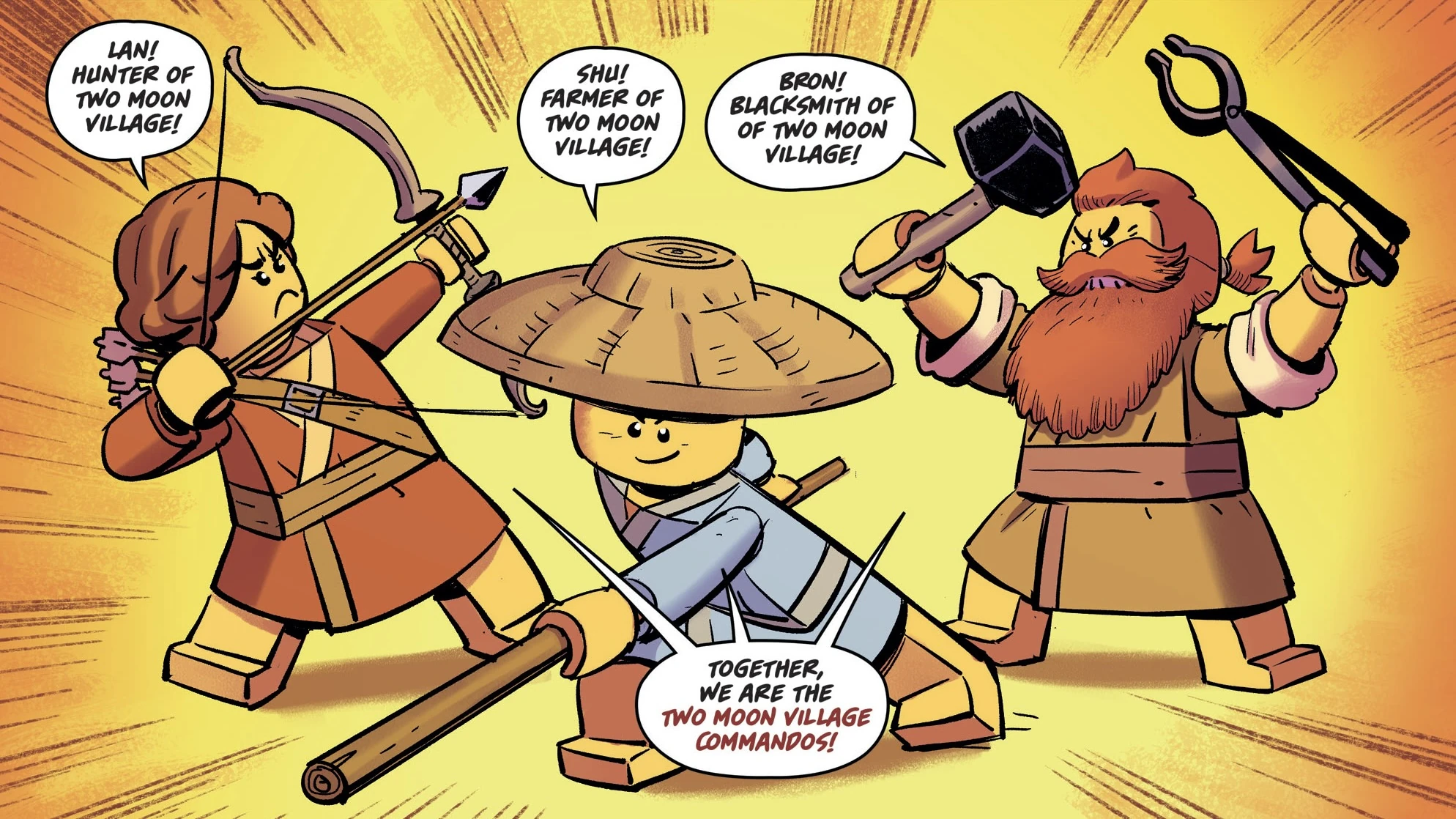 The Two Moon Village Commandos, consisting of Lan the Hunter, Shu the Farmer, and Bron the Blacksmith, accompanied Garmadon in his mission to defeat Kuma, the guardian of Glimwillow Woods, as per the request of Renzo and Kenzo, the elders and village leaders of Two Moon Village. At nightfall, the trio discussed carrying out Garmadon's request to awaken him when night fell, fearing that Garmadon might vaporize them on accident if they touched him. Overhearing their conversation, Garmadon startled the trio by calmly informing them that if he were to vaporize them, it would be an intentional and deliberate act, one without hesitation or remorse. Now fully awake, the former dark lord led the way onward, with the Commandos following his lead.