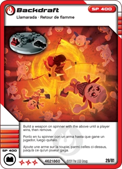 Card 29 - Backdraft is a Build-type Battle card from Wave 1 of the Ninjago Spinners game. It depicts Nya flinging and fighting off a horde of Skulkin warriors.