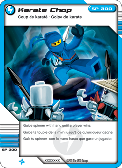 Card 39 - Karate Chop is a Force-Type Battle card from Wave 1 of the Ninjago Spinners game. It depicts Trainee Jay utilizing a Spinjitzu whirlwind to engage Frakjaw and Bonezai in combat.