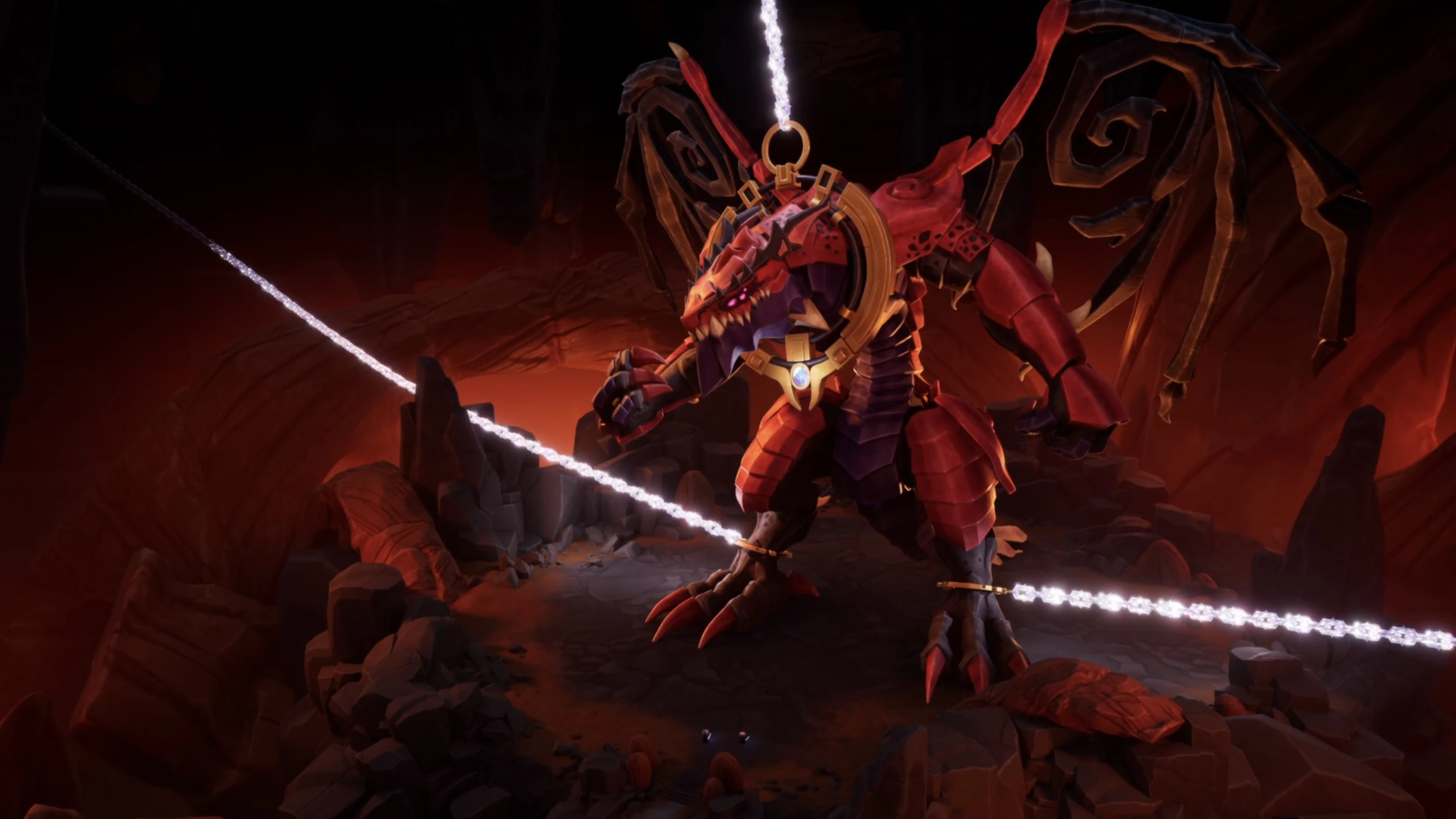 Countless millennia ago, Thunderfang was defeated in battle by the Arc Dragon of Focus and imprisoned beneath the earth of the First Realm. Five chains formed of prismatic steel were crafted to shackle and bind the Storm Dragon, who was then left to lay defeated within his prison, stewing in the humility of his defeat and allowing his anger towards the Source Dragons to grow.